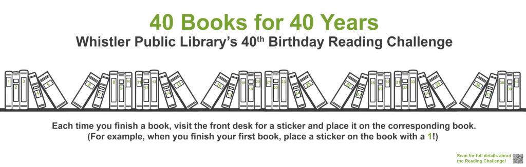 On August 27, 1986, Whistler Public Library opened its doors for the first time. We’re celebrating our 40th birthday all through 2026, and one of the ways that you can celebrate with us is to join our reading challenge, 40 Books for 40 Years. We’re challenging you to read 40 books this year – any genre, fiction or non-fiction, and physical books, ebooks, and audiobooks are welcome.