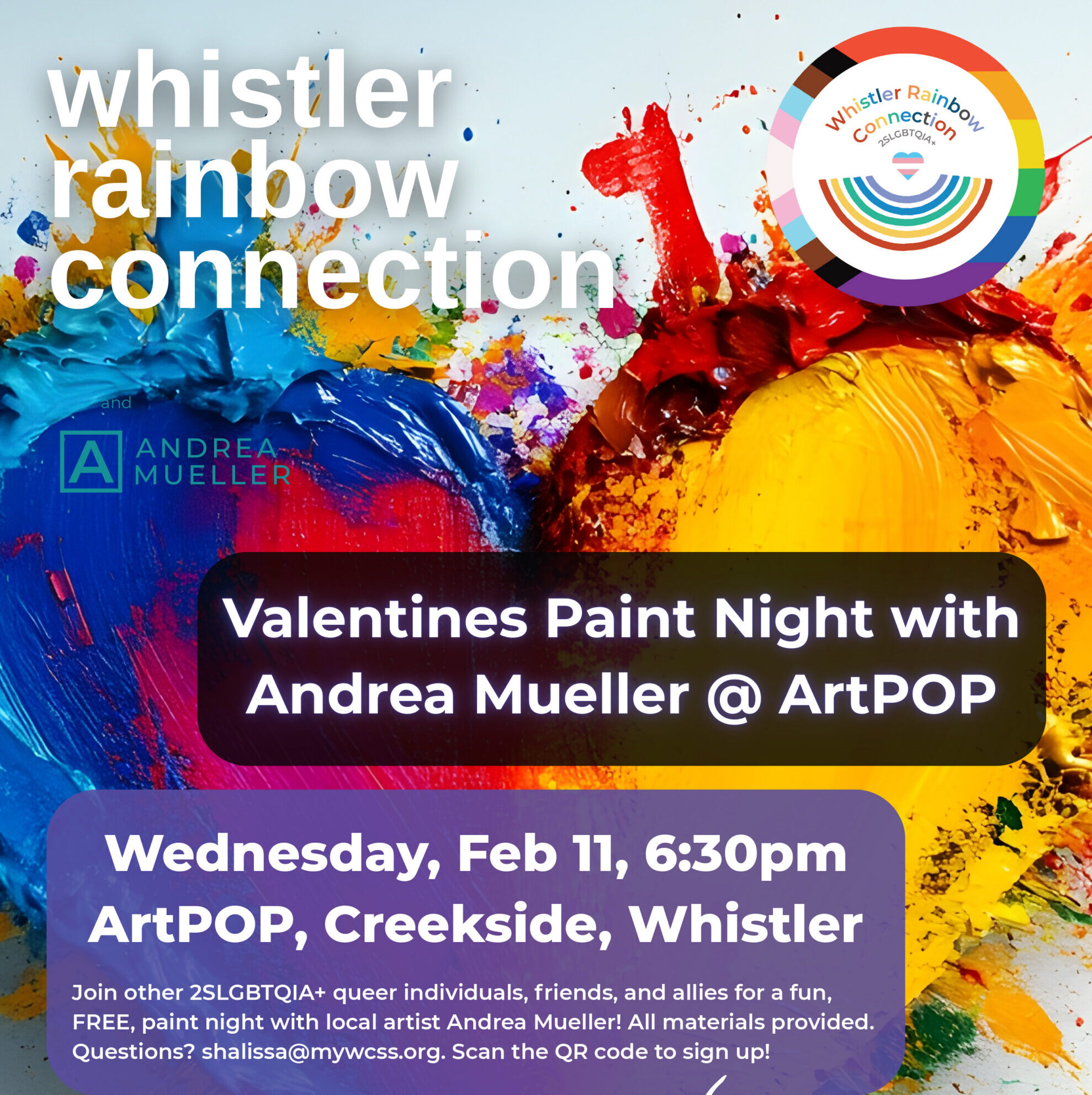 Welcome to Whistler Rainbow Connection, Whistler’s 2SLGBTQIA+ group! We’re excited to collaborate with local artist Andrea Mueller to bring you a Valentines-inspired Paint Night. Join us at Art Pop Whistler (321-2063 Lake Placid Rd) on Wednesday, February 11 for a fun-filled evening of painting and creativity. Let your artistic side shine as you create a masterpiece to take home with you.